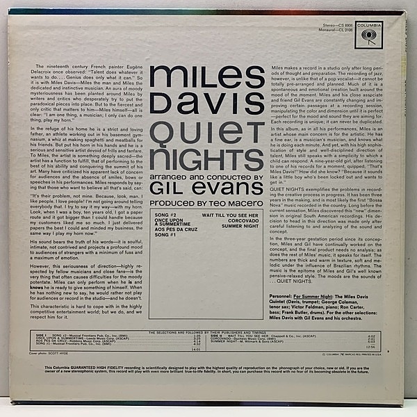 当時流行のボサノヴァも採り入れたり、オーケストラと相俟った神妙な心地よさは真にマイルス流クールサウンドの極みです。