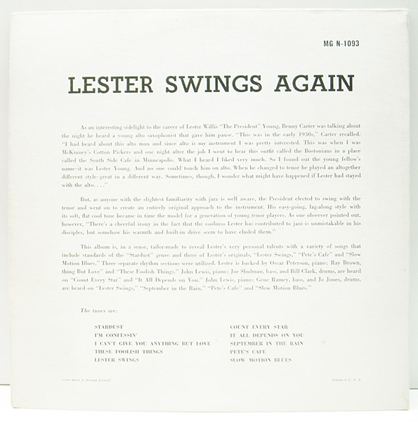 ピーターソン・カルテットなどをバックにレスター・ヤングの凄みのあるテナーを存分に愉しめるワンホーンの極上盤。『MGN 1005 - The President』のジャケット差し替えとなる'56年リリース。
