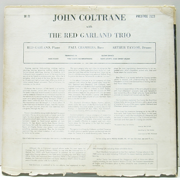 このアルバム以降でも馴染みの共演者となるレッド・ガーランドとポール・チェンバース、アート・テイラーのトリオをバックにしたコルトレーン・ワンホーンのカルテットもの。初リーダーアルバム『Prestige 7105』に次ぐ2nd.アルバムです。ソロが冴え渡るリズミカルな "Traneing In" を筆頭にスリリングな演奏から、マイナームードもたっぷりのバラード "Slow Dance"、"You Leave Me Breathless" まで素晴らしいです。