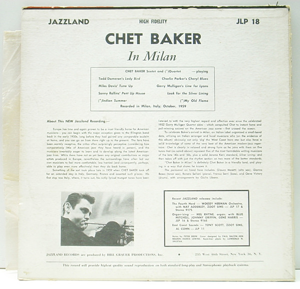 美盤!! FLAT 橙スモール 深溝 USオリジナル CHET BAKER In Milan (Jazzland 18) 現地イタリア勢と共演したミラノ録音 Gianno Basso ほか