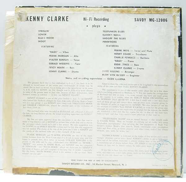 side-Aはパーカー派のアルト奏者フランク・モーガンや、いぶし銀のテナー奏者ウォルター・ベントンをフロントに据えた2管編成による演奏、side-Bにはベイシー楽団でサックス奏者/編曲家として手腕を振るったアーニー・ウィルキンスがベイシー楽団の同朋を集めたセッションを披露しております。ミルト・ジャクソンは全編 "BAGS" 名義で参加(s-Aはvib/s-Bはp)、s-Aにはパーシー・ヒースも参加しており、MJQとは一味違ったアレンジともに快演が愉しめます。