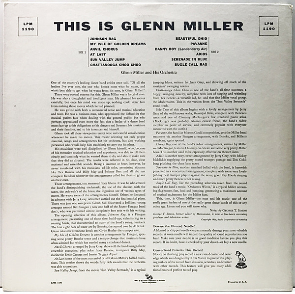 カウント・ベイシー、ベニー・グッドマン、デューク・エリントンらと共にスウィングジャズの代表格に挙げられるグレン・ミラー率いるオーケストラの名演をたっぷり詰め込んだ'56年発表アルバム。曲によって編成やフィーチャーしてるソリストも様々で、A6, B5ではヴォーカル入りも収録されております。黒い背景にワンマンという雰囲気抜群のジャケットも秀逸。