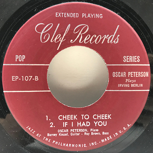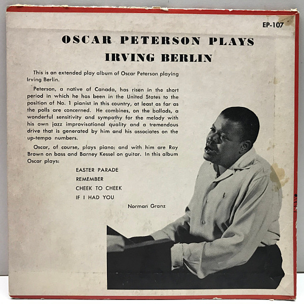 名コンポーザーを取り上げ、当時色違いのジャケットで幾つかリリースされた『Plays 〜』シリーズの一枚。ブラウン&ケッセルとのトリオでアーヴィング・バーリンの佳曲を綴った名盤、4曲入りEPです。