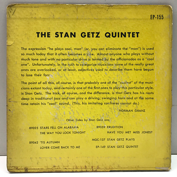 スタン・ゲッツ絶頂期の頃に吹き込まれた永年人気の高い名盤、子供がキスしているジャケット=『The Artistry Of Stan Getz Plays』にも収録されてる4曲入りEPの原盤です。