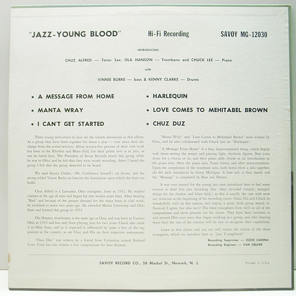 Chuz Alfred(ts) Ola Hanson(tb) Chuck Lee(p) Vinnie Burke(b) Kenny Clarke(ds)