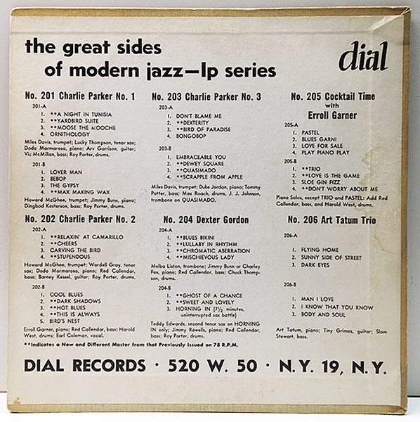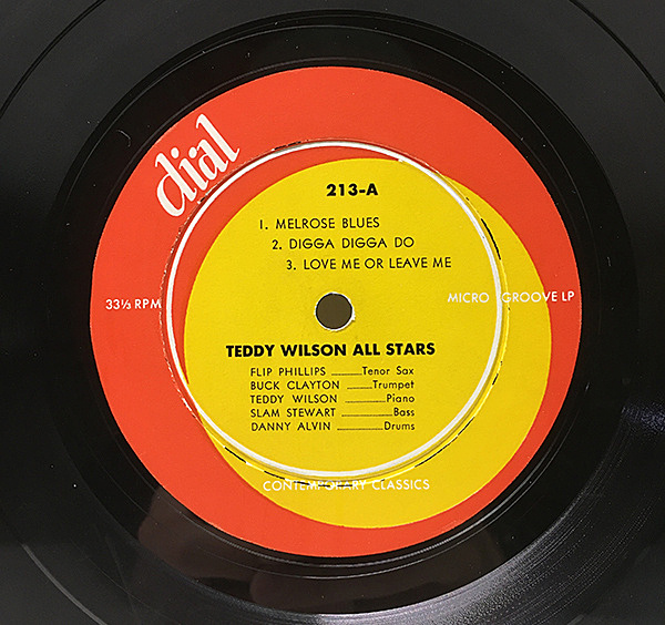 激レアなDialパーカーなど初の12"LPリリースでも知られるレーベル・オーナーのロス・ラッセル主宰レーベル=Dialからリリースされた珍盤で、前半4曲(A1-B1)はフリップ・フィリップス、バック・クレイトンらとのクインテット演奏が収録。後半2曲(B2-B3)はサッチモやベニー・グッドマン楽団などで活躍したビバップシーンを代表するドラマー、シド・カトレットをリーダーとしたハンク・ジョーンズらが参加した演奏が収録。