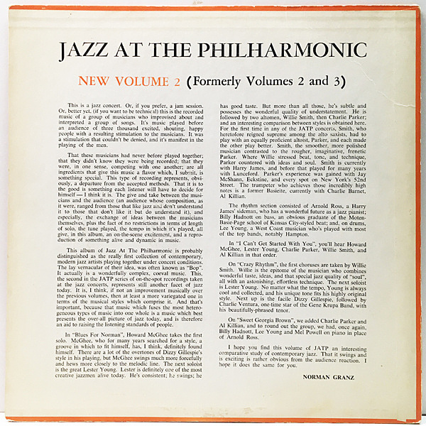バード、ウィリー・スミス、レスター・ヤング、ハワード・マギーらが参加したノーマン・グランツ主宰のJATPオールスターズで贈る好セッション『Jazz At The Philharmonic Vol.2』1946年1月28日のライヴ録音を収めた名盤です。