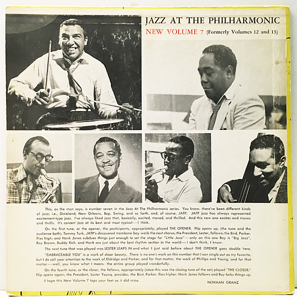 バード、レスター・ヤング、ハンク・ジョーンズらを擁するノーマン・グランツ主宰のJATPオールスターズによる好セッション!コチラは'53年にリリースされた10インチのVol.12と13をそれぞれカップリングした『Jazz At The Philharmonic New Vol.7』12"LP仕様です。