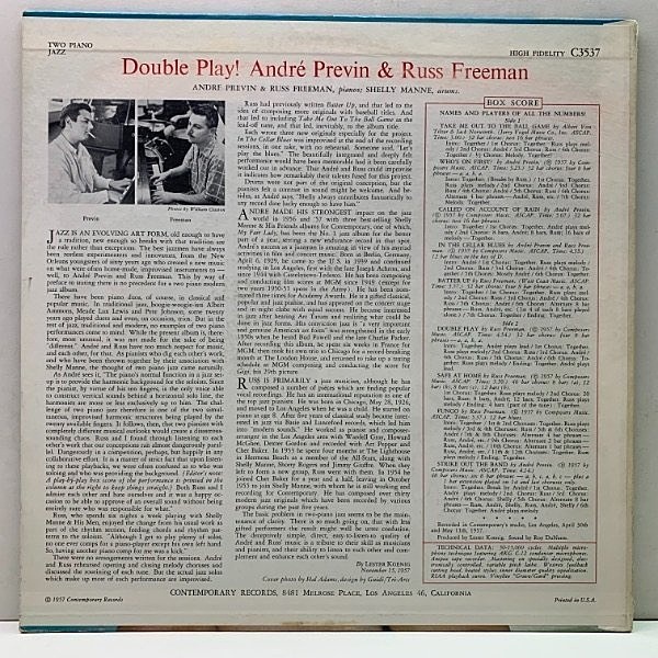 レアな美品!! US 完全オリジナル 裏2色刷り MONO 深溝 ANDRE PREVIN & RUSS FREEMAN Double Play! ('57 Contemporary C 3537) D2・D1マト