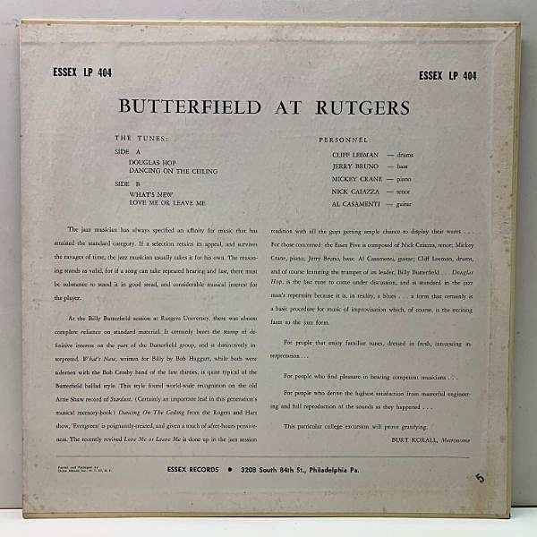 白人の名トランペッター、ビリー・バターフィールド率いるバンドによるNJ, ラトガース大学の実況ライヴ。ゴールドブラットによるアートワークにも惹かれるシリーズ4部作の一枚で、録音はあのヴァンゲルダーによるもの。定評ある音質はもちろん、最高に味わい深い中間派〜モダンジャズの好演が愉しめるまさに通好みな逸品です。マイナーレーベル故、このレコード中々見ません。