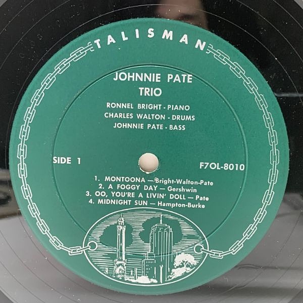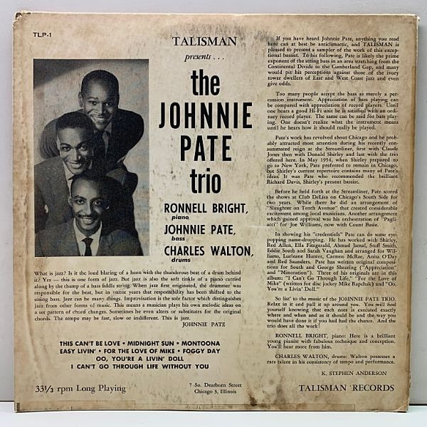 後にブラックスプロイテーションを中心とした映画音楽家として名を馳せるジョニー・ペイトのキャリア最初期となるジャズベーシストとして嘱望されていた頃のトリオ演奏を収録。ロンネル・ブライトの好演が光っております。地元シカゴのカスタム(自主)レーベルTalismanに残されたもので、お探しの方はご存知の様に非常に入手困難な10インチです。