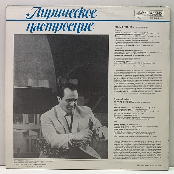 主にクラシックで音質に定評ある旧ソ連の国営レーベルMelodiyaでの録音で、タイトルのようにリリシズムに溢れるムーディな内容。中盤のスウィンギーな転調も感動的な "Interlude"、優美なボサノヴァのリズムに乗った "Bossa Nova"、晴れやかでノスタルジックなサウンドが最高に心地良い "Smile"、"Ballad" など全10曲。