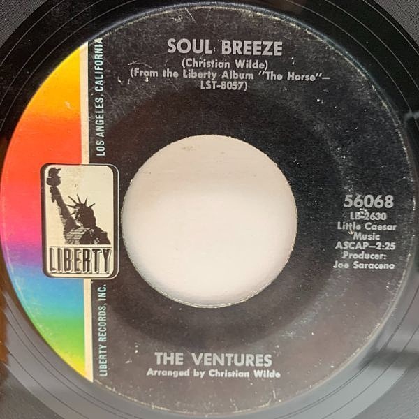 エレキブームを巻き起こしたガレージ・サーフ・ロックの火付け役、ザ・ベンチャーズの'68年発表7インチです。アメリカCBS系で放映されていた刑事ドラマのテーマ曲のカヴァー "Hawaii Five-O"、メロウ・インスト "Soul Breeze" をカップリング。