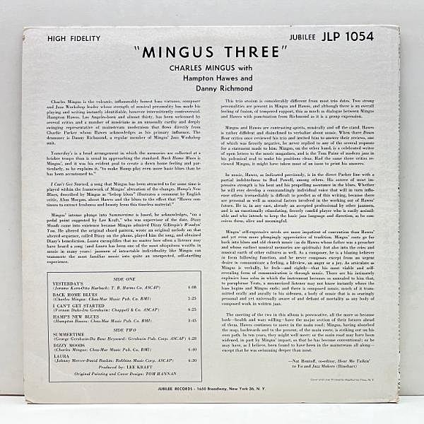 途中でトイレに行ったホウズに代わり、セッションの見学に来ていたソニー・クラークが客演(1曲通して交代したのか?途中で交代したのか?1曲通して録り直したのか?)した A3 "I Can't Get Started" の逸話でも知られるミンガスがJubileeに残したレアなトリオもの。