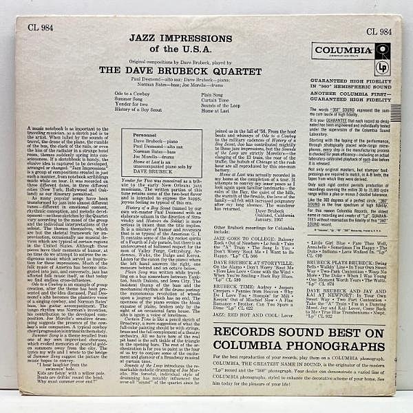 レコードメイン画像:良好盤!! MONO 初版 6eye 深溝 USオリジナル DAVE BRUBECK QUARTET Jazz Impressions Of The U.S.A. (Columbia CL 984) シリーズ第一弾