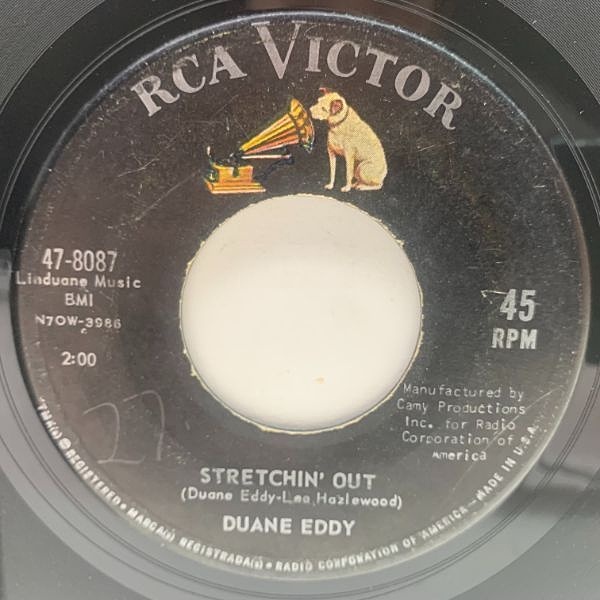 後のベンチャーズにも通ずる「ギターインスト」を確立させた元祖ギターヒーローことデュアン・エディのシングル。レベレッツなるエディ専属の女子隊がコーラスで参入した "(Dance With The) Guitar Man"、サックス入りの渋めのナンバー "Stretchin' Out" をカップリング。