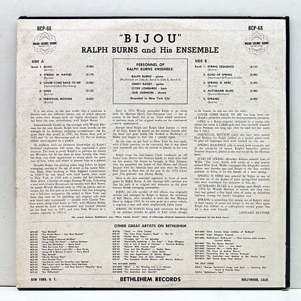米国のピアニスト〜作曲家〜アレンジャー、ラフル・バーンズの珍しいコンボ演奏でのリーダー作品。ジミー・レイニー、オシー・ジョンソンらを招いたカルテット編成で自身もピアノを弾いております。ウディ・ハーマン楽団時代の代表曲 "Bijou" を含むオリジナル7曲に、粋なアレンジでスタンダード "Lover Come Back To Me" など演っております。