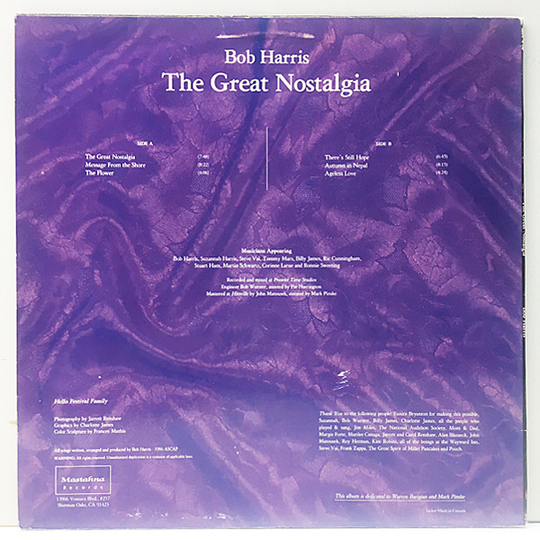 マザーズに参加していた事でも知られるロス出身のボブ・ハリス(vo/tp/key)が放った唯一のアルバム。ザッパ門下生の同朋スティーヴ・ヴァイ(Sitar)らが参加した浮遊感たっぷりのエモーショナルで心洗われるニューエイジなサウンドは、ECM周辺好きにも超マストな逸品!