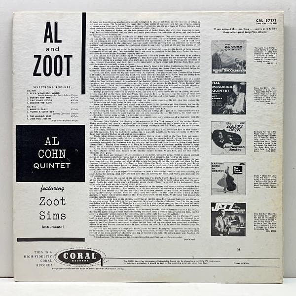 レコードメイン画像:良好!音抜群! ひずみ無し USオリジナル FLAT, MONO 深溝 AL COHN Quintet Featuring ZOOT SIMS (Coral CRL 57171) アル・アンド・ズート