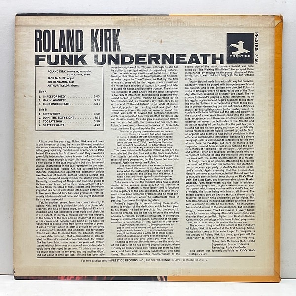 サックス、マンゼル、ストリッチと3管のマウスピースを同時に咥えた鬼才っぷりもさる事ながら、その気鋭に溢れまくった圧巻の若きカークの凄みを体現できる唯一のプレスティッジ録音。ジャック・マクダフのコテコテのオルガンと相まるソウルフルな快演を中心に、中盤の晴れやかな展開も素晴らしい唯一のバラード "Too Late Now" でのモダンなプレイまで痺れます。