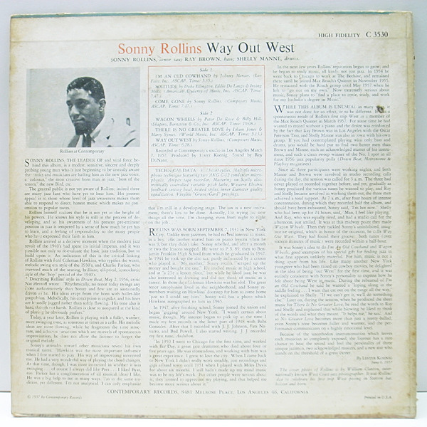 MONO 深溝 USオリジナル SONNY ROLLINS Way Out West (Contemporary C 3530) RAY BROWN, SHELLY MANNE ピアノレス・トリオ 名