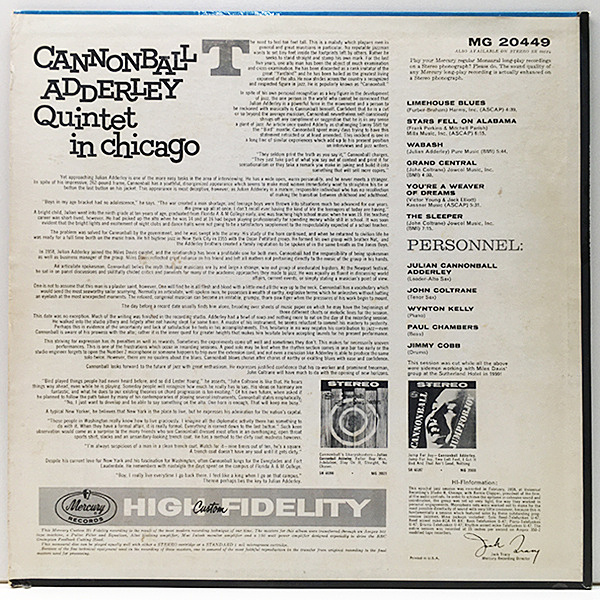レアな美品!! USオリジナル MONO 黒銀ラベル CANNONBALL ADDERLEY In Chicago ('59 Mercury) John Coltrane, Wynton Kelly ほか
