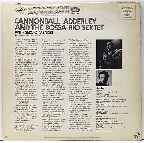 "Clouds"、"Minha Saudade" などのスタンダードから、セルメン作のクールな "Groovy Samba" ほか、小気味好いボサ・リズムを伴奏にキャノンボールのワンホーンが冴えまくる最高に気持ち良いボサ・ジャズの極上盤です。