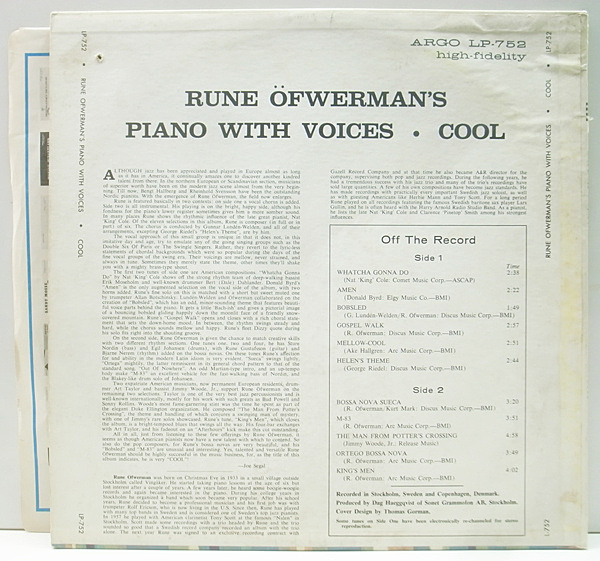 スウェーデン出身のジャズ・ピアニスト、ルネ・オファーマンによるストックホルムとコペンハーゲンでの録音を記録したラウンジ・ジャズ・アルバム。A面はコーラスやスキャットをフィーチャーしたスウィンギーな内容。一変B面は北欧らしいクールで洗練された渋いインスト・ジャズになっております。