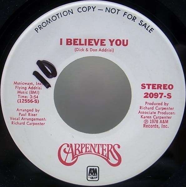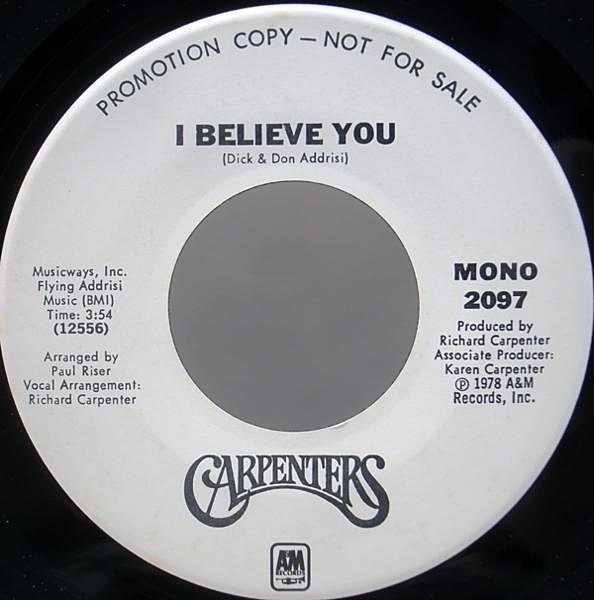 レア プロモ 7オンリー MONO オリジナル CARPENTERS I Believe You ('78 A&M) モノラル 45RPM.