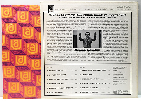 ルグラン自らがオーケストラを指揮したもので、"CHANSON D'UN JOUR D'ETE"、"CHANSON DES JUMELLES"、"MARINS AMIS AMANTS OU MARIS"、"CHANSON DE SOLANGE" 等々、一聴して解るエスプリの効いた独特のルグラン・サウンドは何も素晴らしいアレンジに仕上がっております。