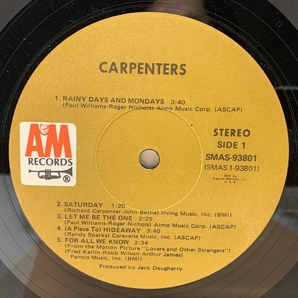 ジャケットは通常同様にロゴとフチの少し内側にエンボス加工が施されたテクスチャード・ゲートフォールド仕様の特殊な手紙型で、上辺の両端にはそれぞれ「93801 PRINTED IN U.S.A.」「CARPENTERS A&M SP 3502」2種印刷がありますが、通常とは違い左端に93801表記のある入れ替えのないCapitol仕様になります。