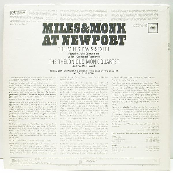 A面にコルトレーン、エヴァンス擁するマイルス・グループ、B面にはピー・ウィー・ラッセルを加えたモンク・グループのニューポート・ジャズ・フェスティヴァルに於ける二つのセッションを収めたライヴ録音です。