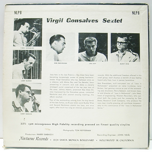 ヴァージル・ゴンザルヴェスなるバリトン奏者がマイナーNocturneに残した数少ない貴重なリーダー作品。Virgil Gnsalves(bs) Buddy Wise(ts) Bob Enevoldsen(v-tb) Lou Levy(p) Harry Babasin(b) Larry Bunker(ds)