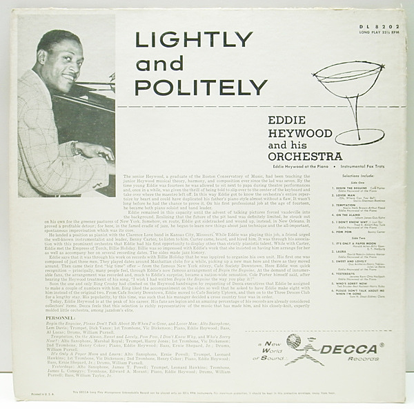 14歳という若さでプロ・デビュー、24歳にはベニー・カーター楽団へ加入、その後もエラやビリー・ホリデイらの伴奏を勤めたりと錚々たるキャリアを持つ名ピアニスト、エディ・ヘイウッドの40年代のNY録音を記録したスモールコンボとのライトで爽快な演奏です。